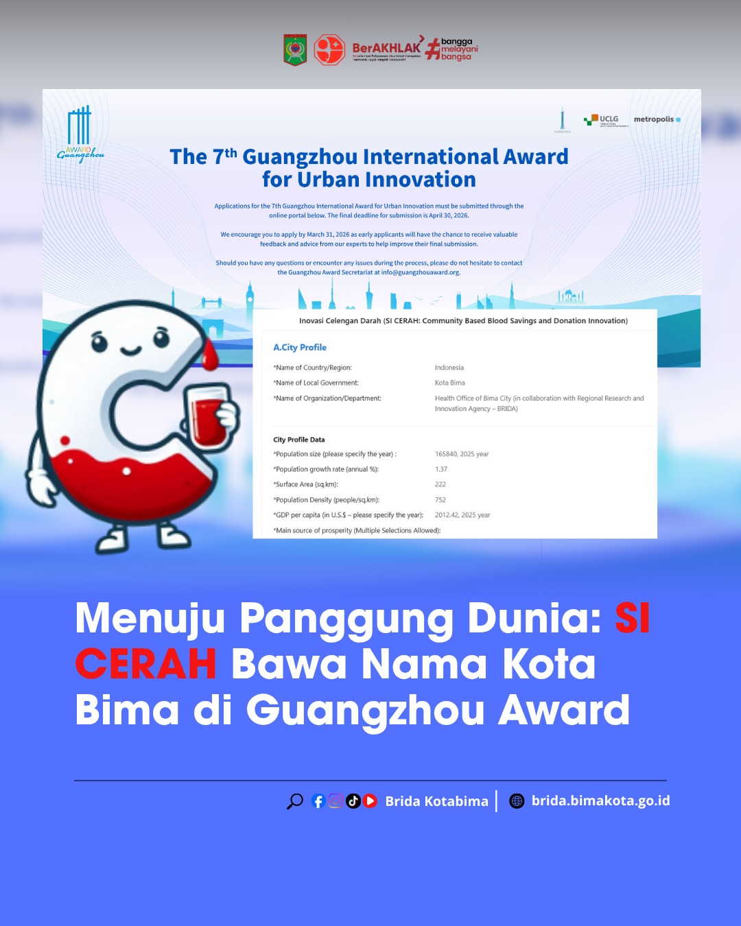 Kota Bima kembali menunjukkan komitmennya dalam mendorong inovasi pelayanan publik dengan secara resmi mendaftarkan inovasi SI CERAH (Celengan Darah) pada ajang internasional The 7th Guangzhou International Award for Urban Innovation.